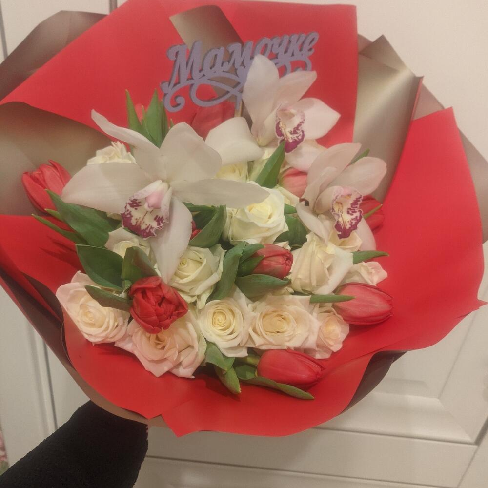 Букет ” Яркая жизнь” красивый и стильный букет из орхидей, тюльпанов и роз.Шикарный подарок, просто закажи.